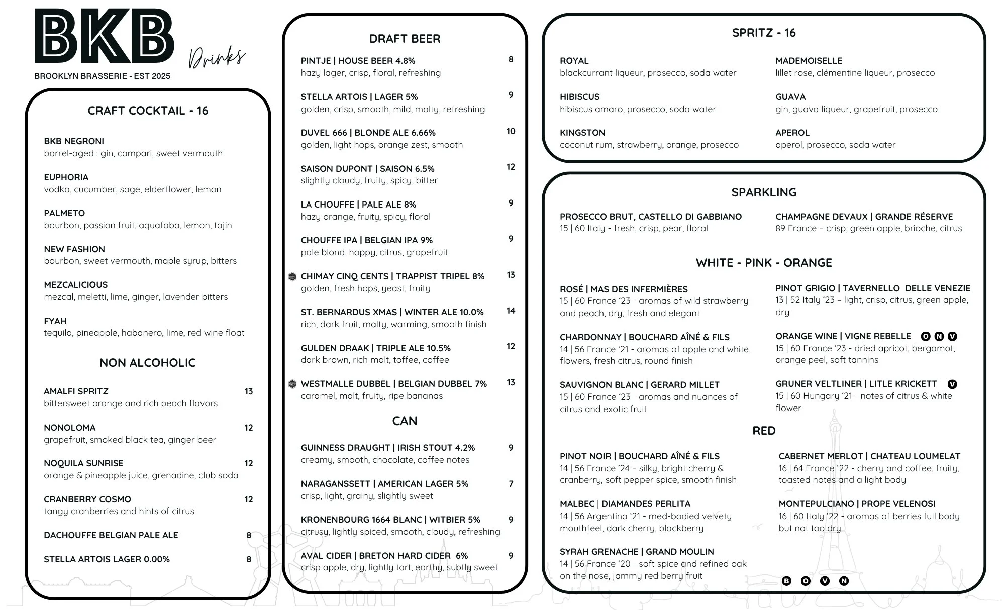 Dinner menu at BKB Brooklyn Brasserie featuring Belgian-inspired entrees, small plates, and drinks